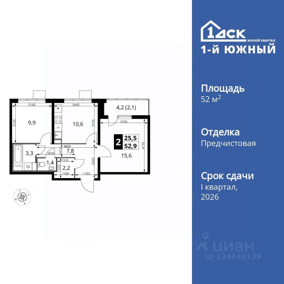 Продаётся 2-к квартира номер 383 общей площадью 52.9 кв.м. на 25-м этаже 25 этажного здания. Отделка Whitebox. Цена с учётом скидки.