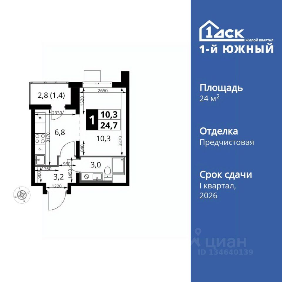 Продаётся квартира-студия номер 426 общей площадью 24.7 кв.м. на 7-м этаже 24 этажного здания. Отделка Whitebox.