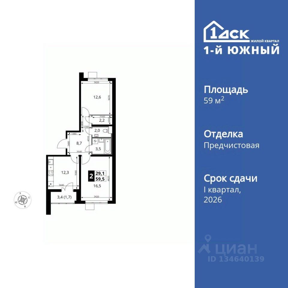 Продаётся 2-к квартира номер 617 общей площадью 59.5 кв.м. на 12-м этаже 24 этажного здания. Отделка Whitebox. Цена с учётом скидки.