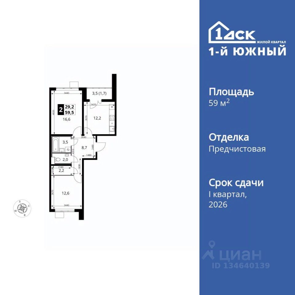 Продаётся 2-к квартира номер 762 общей площадью 59.5 кв.м. на 15-м этаже 24 этажного здания. Отделка Whitebox. Цена с учётом скидки.