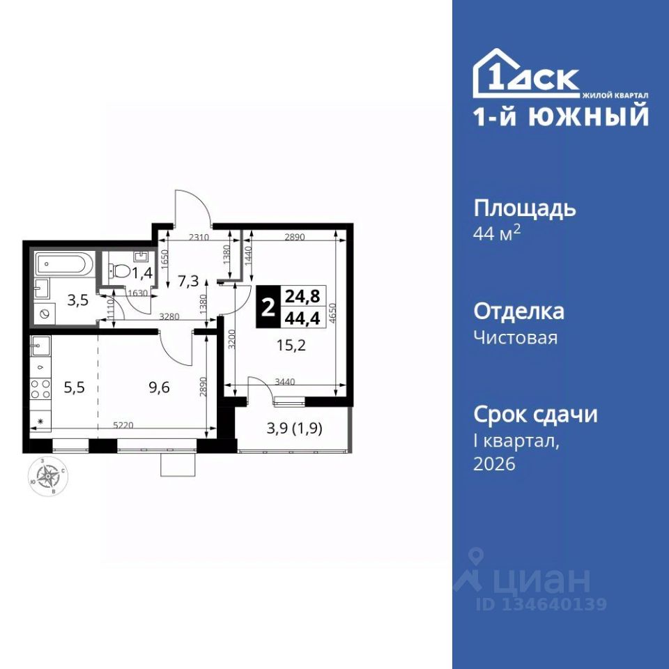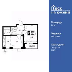 Продаётся 2-к квартира номер 866 общей площадью 44.4 кв.м. на 11-м этаже 24 этажного здания. Чистовая отделка. Цена с учётом скидки.