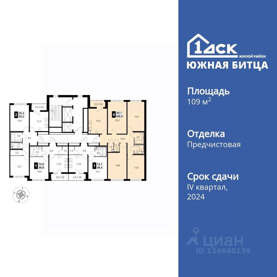 Продаётся 4-к квартира номер 589 общей площадью 109.1 кв.м. на 22-м этаже 23 этажного здания. Отделка Whitebox. Цена с учётом скидки.