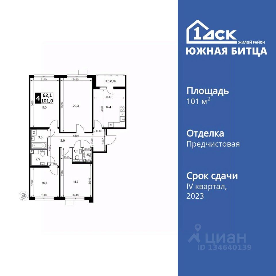 Продаётся 4-к квартира номер 495 общей площадью 101.2 кв.м. на 20-м этаже 23 этажного дома. Отделка Whitebox. Цена с учётом скидки!