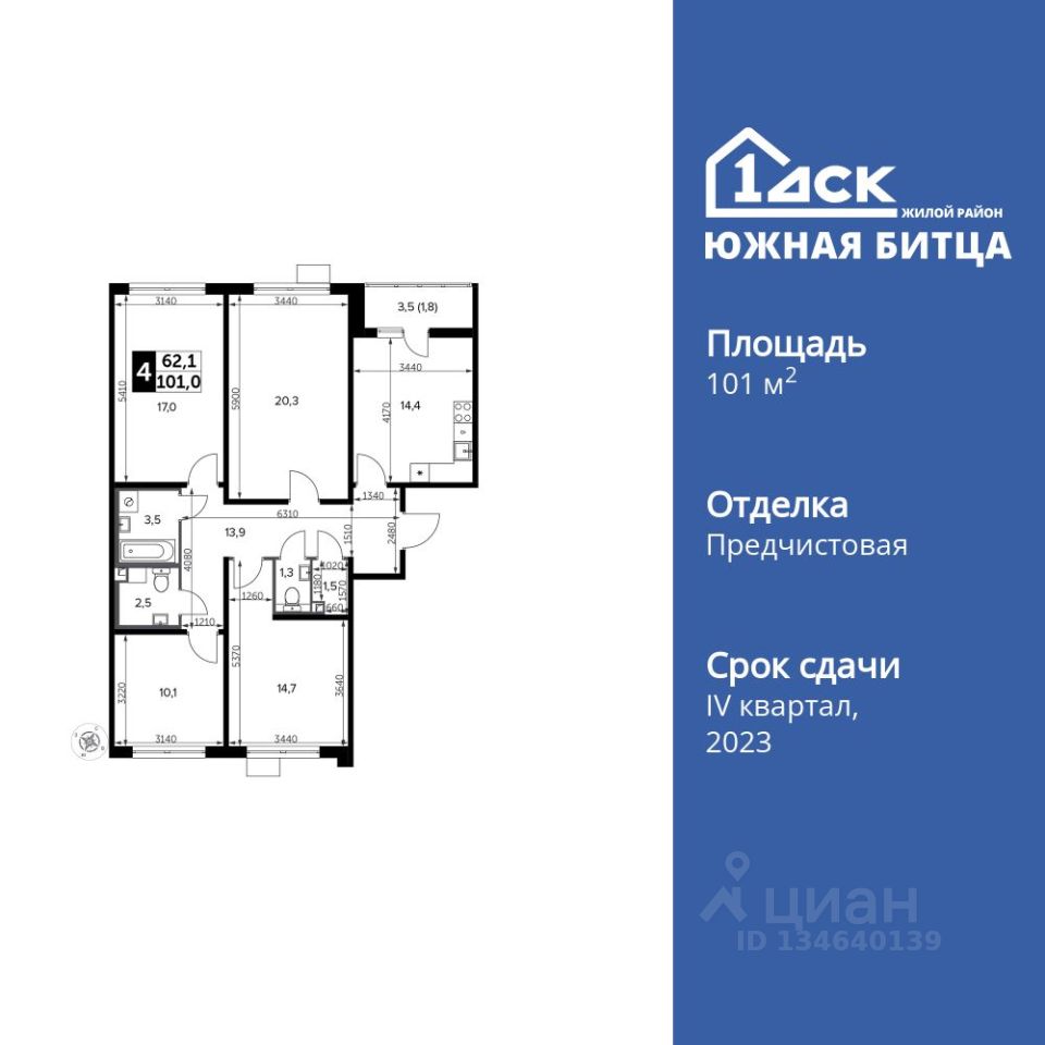 Продаётся 4-к квартира номер 495 общей площадью 101.2 кв.м. на 20-м этаже 23 этажного здания. Отделка Whitebox. Цена с учётом скидки.