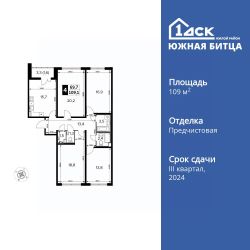 Продаётся 4-к квартира номер 629 общей площадью 109.5 кв.м. на 21-м этаже 24 этажного дома. Отделка Whitebox. Цена с учётом скидки!