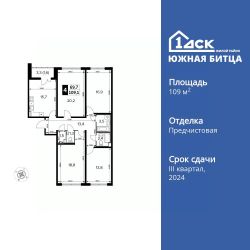 Продаётся 4-к квартира номер 637 общей площадью 109.5 кв.м. на 23-м этаже 24 этажного здания. Отделка Whitebox. Цена с учётом скидки.