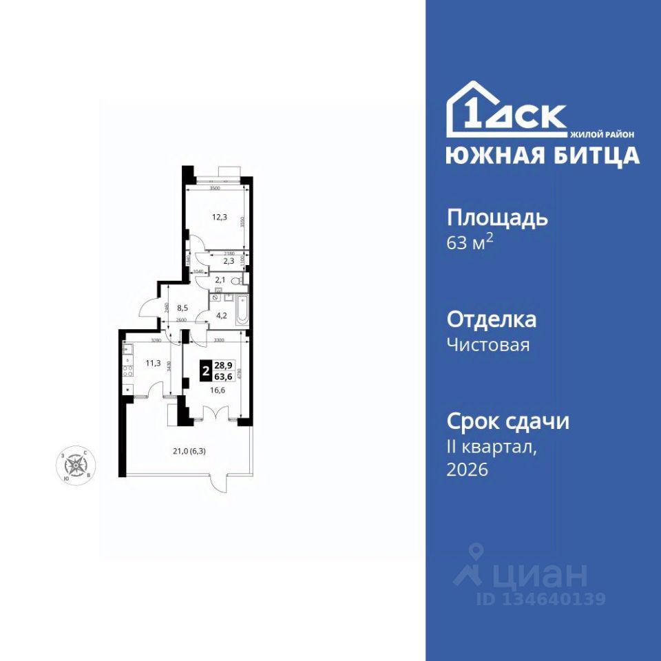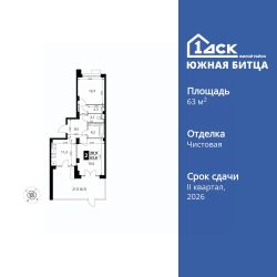 Продаётся 2-к квартира номер 348 общей площадью 63.5 кв.м. на 1-м этаже 22 этажного здания. Чистовая отделка.