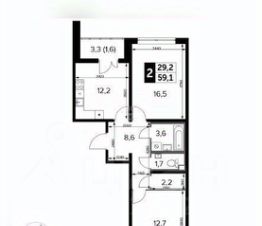 Общая площадь: 59.1 м. Идеальная планировка, распашонка, большая кухня 12.2 кв м, комнаты 16.5 / 12.7 кв м. Из кухни идёт застеклённая лоджия. Отделка WhiteBox - залит пол уже. Вид из окон на 2 стороны