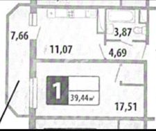 Площадь квартиры без учета лоджий 39,44 м2, комната 17, 51 м2, кухня 11, 07 м2.