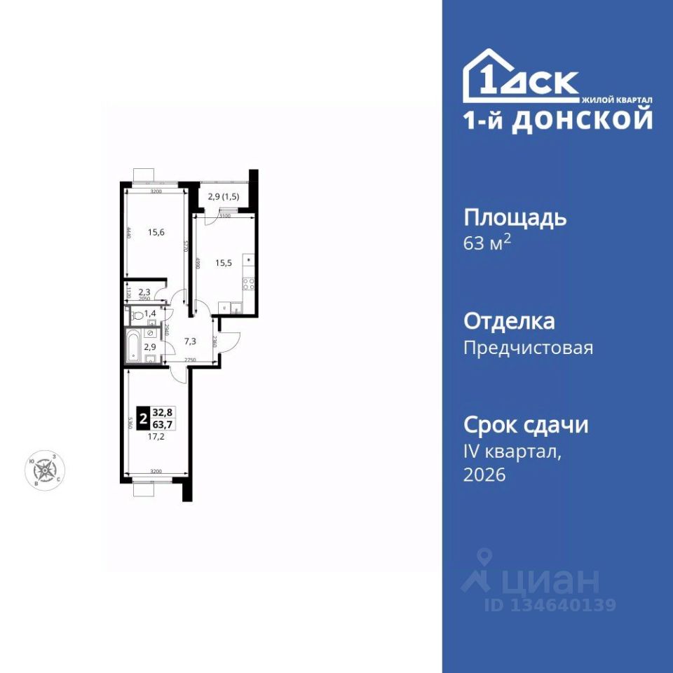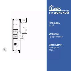 Продаётся 2-к квартира номер 537 общей площадью 63.7 кв.м. на 7-м этаже 24 этажного здания. Отделка Whitebox.