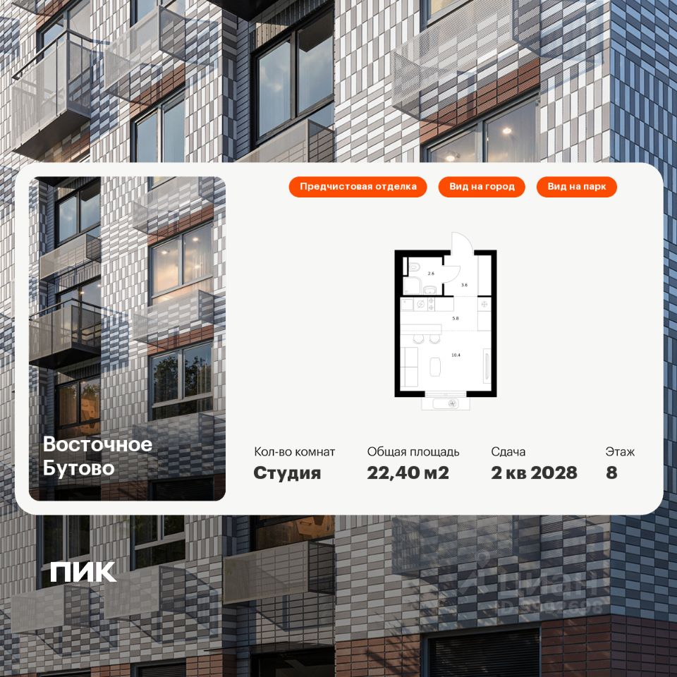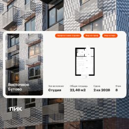 Продаётся квартира-студия площадью 22,4 кв.м на 8 этаже 25 этажного дома (Корпус 47, Секция 3) проекта ПИК Восточное Бутово. Светлый просторный подъезд на уровне земли, функциональная планировка, большие окна, предчистовая отделка.