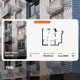 Продаётся 2-комн. квартира площадью 49,3 кв.м на 24 этаже 25 этажного дома (Корпус 55, Секция 1) проекта ПИК Восточное Бутово. Светлый просторный подъезд на уровне земли, функциональная планировка, большие окна, предчистовая отделка.