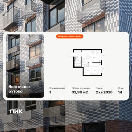 Продаётся 1-комн. квартира площадью 32,9 кв.м на 14 этаже 25 этажного дома (Корпус 55, Секция 1) проекта ПИК Восточное Бутово. Светлый просторный подъезд на уровне земли, функциональная планировка, большие окна, предчистовая отделка.