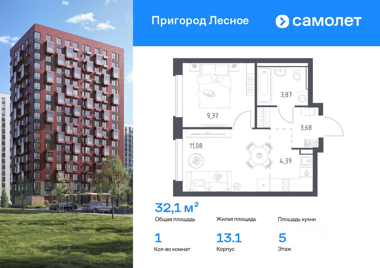Предлагается 1-комнатная квартира комфорт-класса 32,1 кв.м в корпусе 13.1 на 5 этаже, в ЖК "Пригород Лесное"