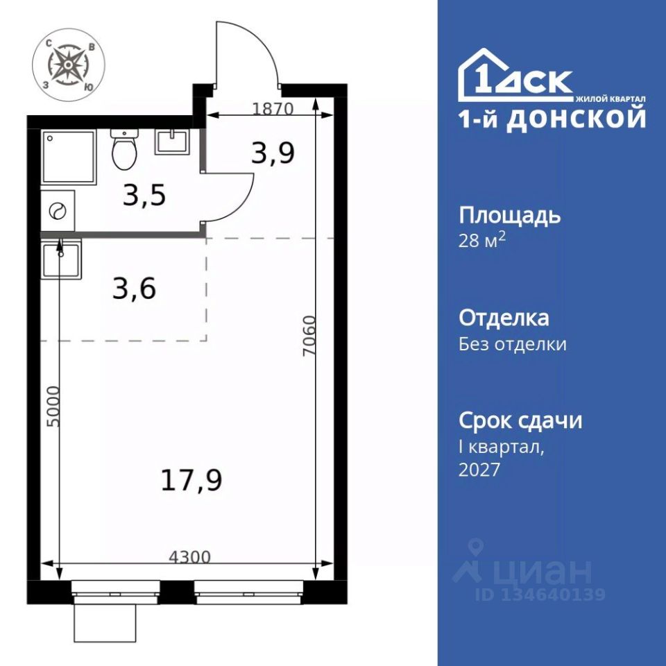 Продаётся квартира-студия номер 518 общей площадью 28.9 кв.м. на 24-м этаже 24 этажного здания. Без отделки.