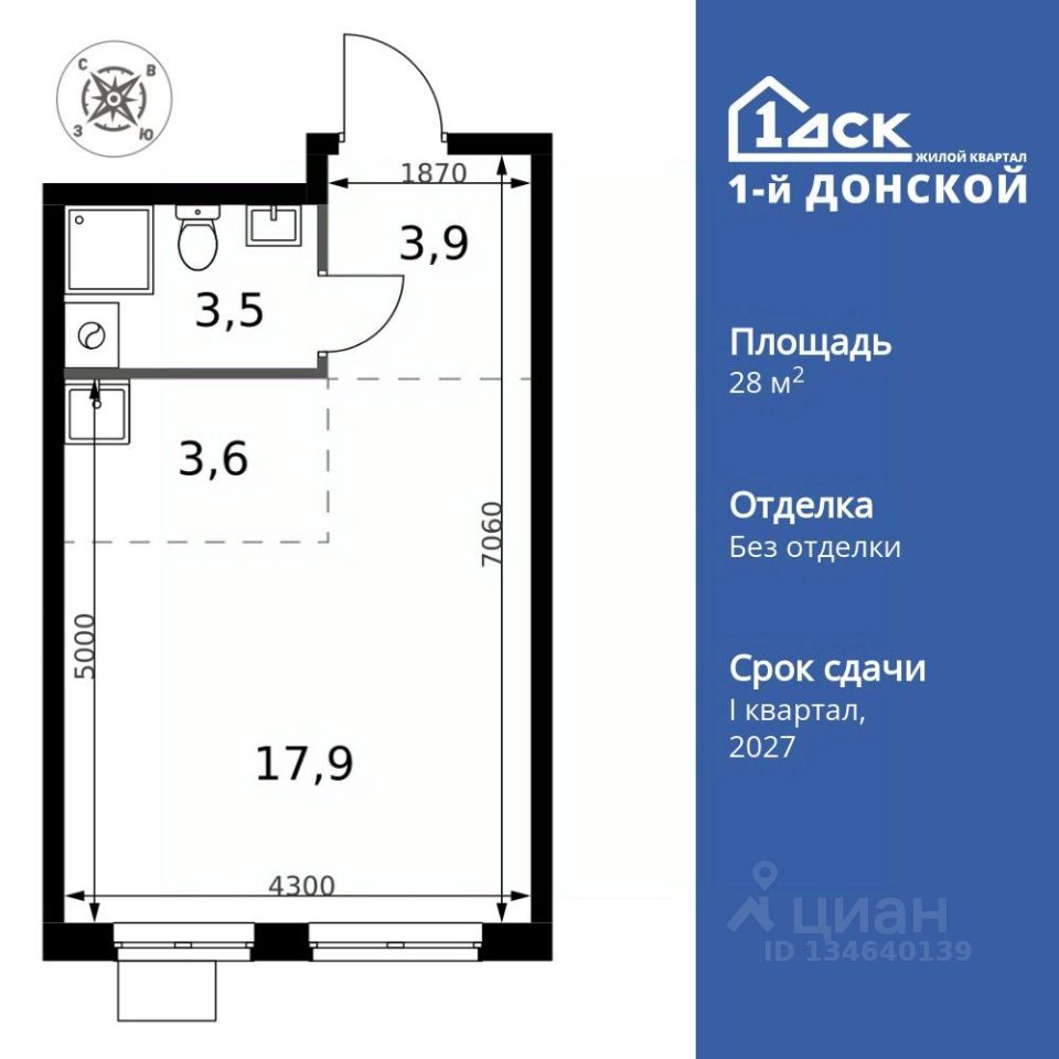Продаётся квартира-студия номер 302 общей площадью 28.9 кв.м. на 6-м этаже 24 этажного здания. Без отделки.