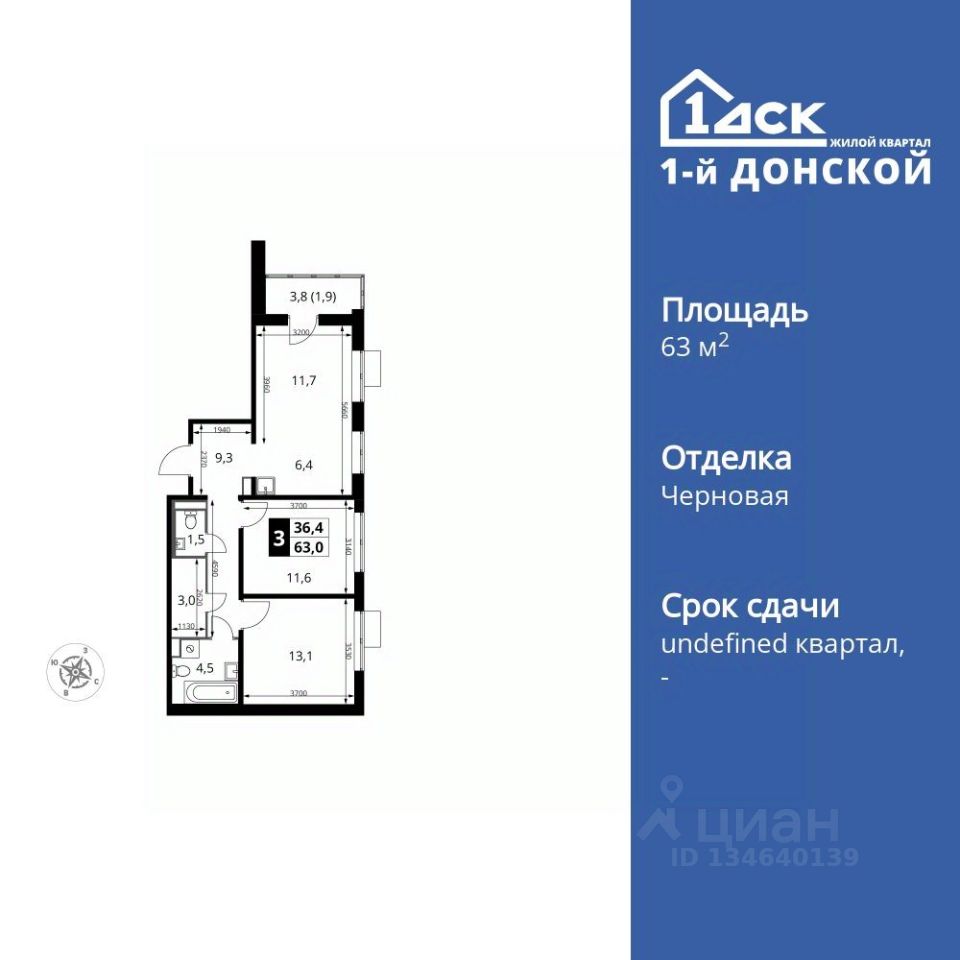 Продаётся 3-к квартира номер 153 общей площадью 63 кв.м. на 15-м этаже 24 этажного дома. Отделка Whitebox.