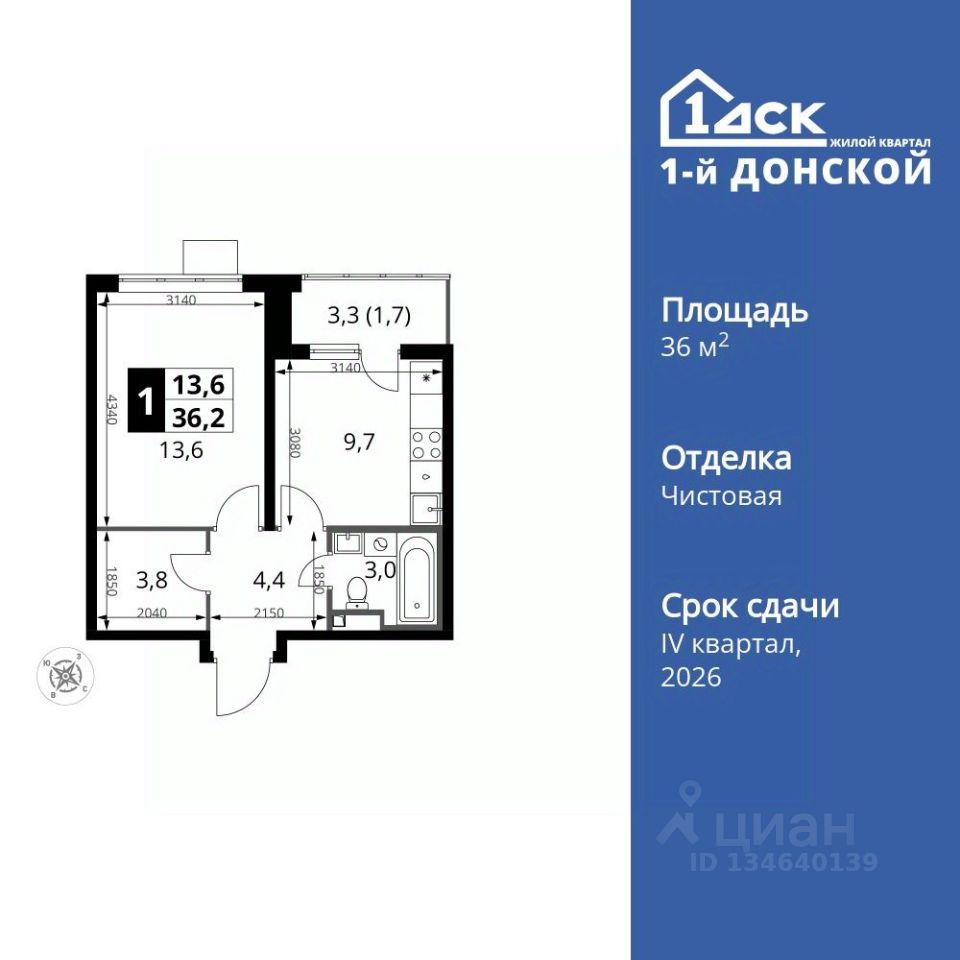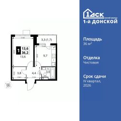 Продаётся 1-к квартира номер 134 общей площадью 36.2 кв.м. на 15-м этаже 24 этажного здания. Чистовая отделка.