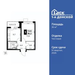 Продаётся 1-к квартира номер 95 общей площадью 36.2 кв.м. на 11-м этаже 24 этажного здания. Чистовая отделка.