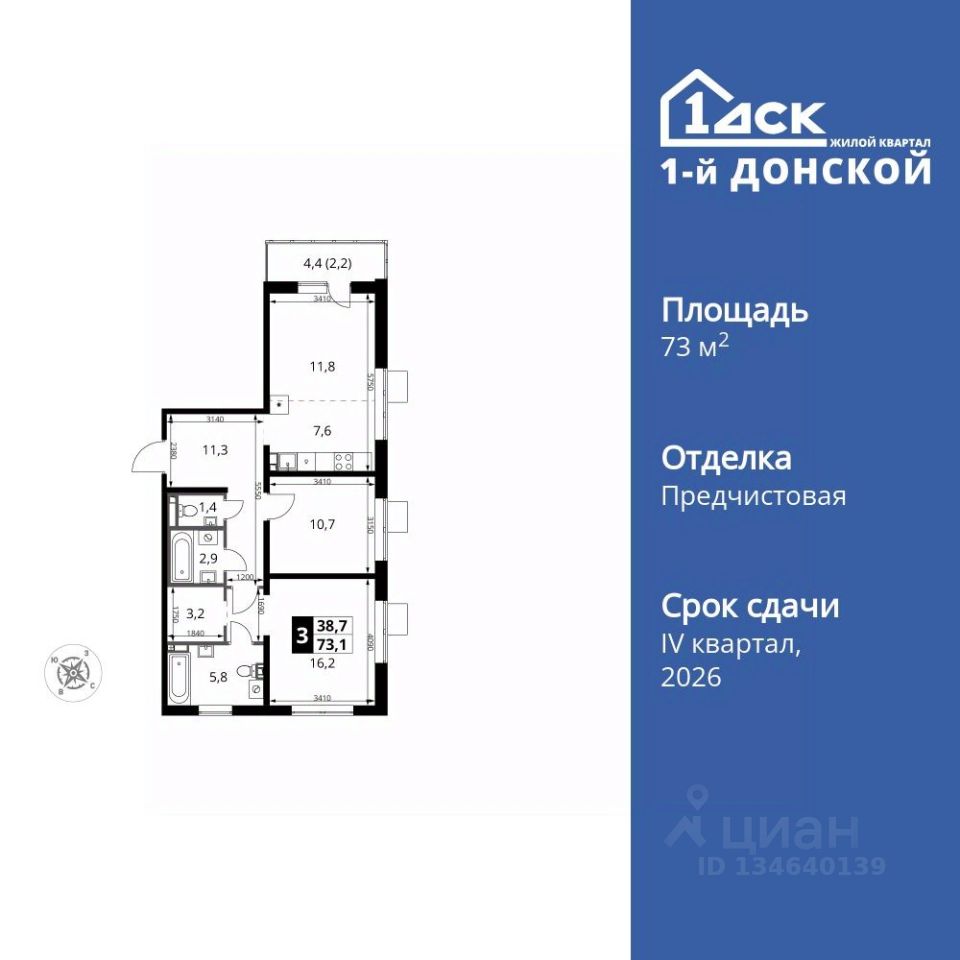 Продаётся 3-к квартира номер 393 общей площадью 73.1 кв.м. на 16-м этаже 24 этажного здания. Отделка Whitebox.