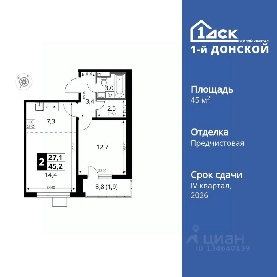 Продаётся 2-к квартира номер 657 общей площадью 45.2 кв.м. на 21-м этаже 24 этажного дома. Отделка Whitebox.