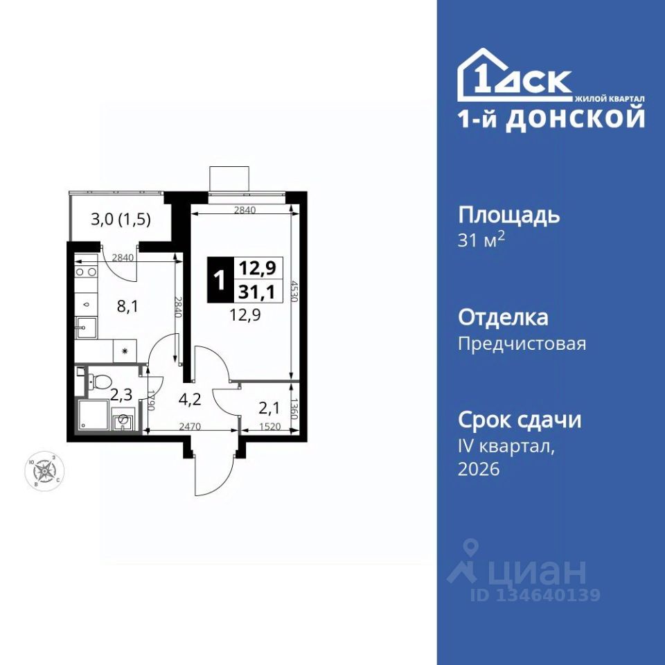 Продаётся 1-к квартира номер 893 общей площадью 31.1 кв.м. на 22-м этаже 24 этажного дома. Отделка Whitebox.