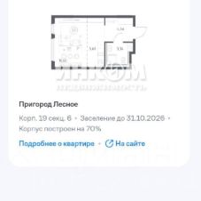 Студия комфорт-класса 24 кв.м на 10 этаже, в ЖК "Пригород Лесное" .