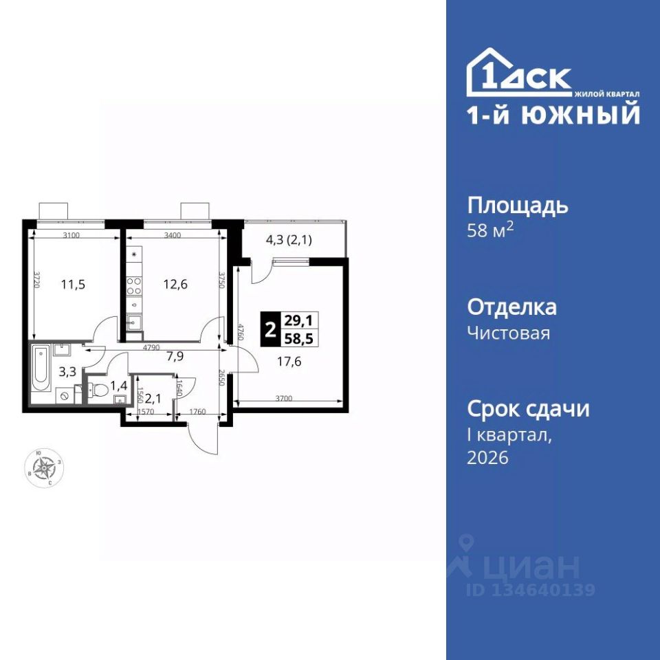 Продаётся 2-к квартира номер 2 общей площадью 58.5 кв.м. на 2-м этаже 25 этажного здания. Чистовая отделка. Цена с учётом скидки.