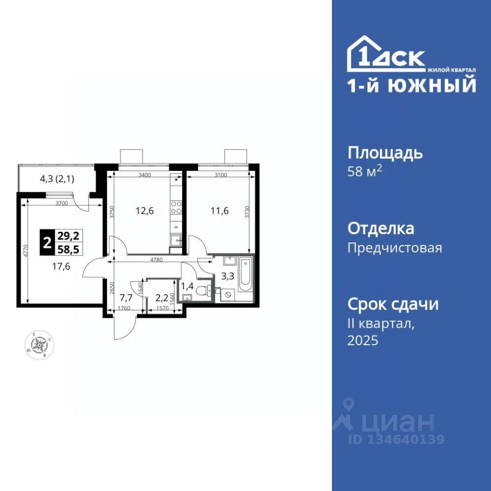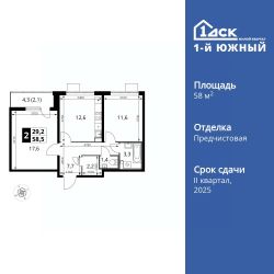 Продаётся 2-к квартира номер 132 общей площадью 58.4 кв.м. на 8-м этаже 24 этажного здания. Отделка Whitebox. Цена с учётом скидки.