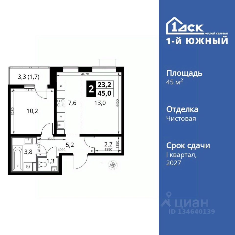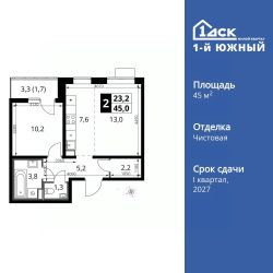 Продаётся 2-к квартира номер 138 общей площадью 45 кв.м. на 7-м этаже 24 этажного здания. Чистовая отделка.