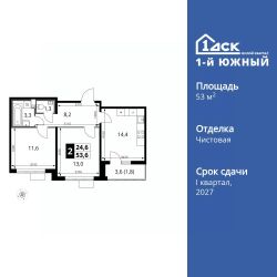 Продаётся 2-к квартира номер 169 общей площадью 53.6 кв.м. на 11-м этаже 24 этажного здания. Чистовая отделка.