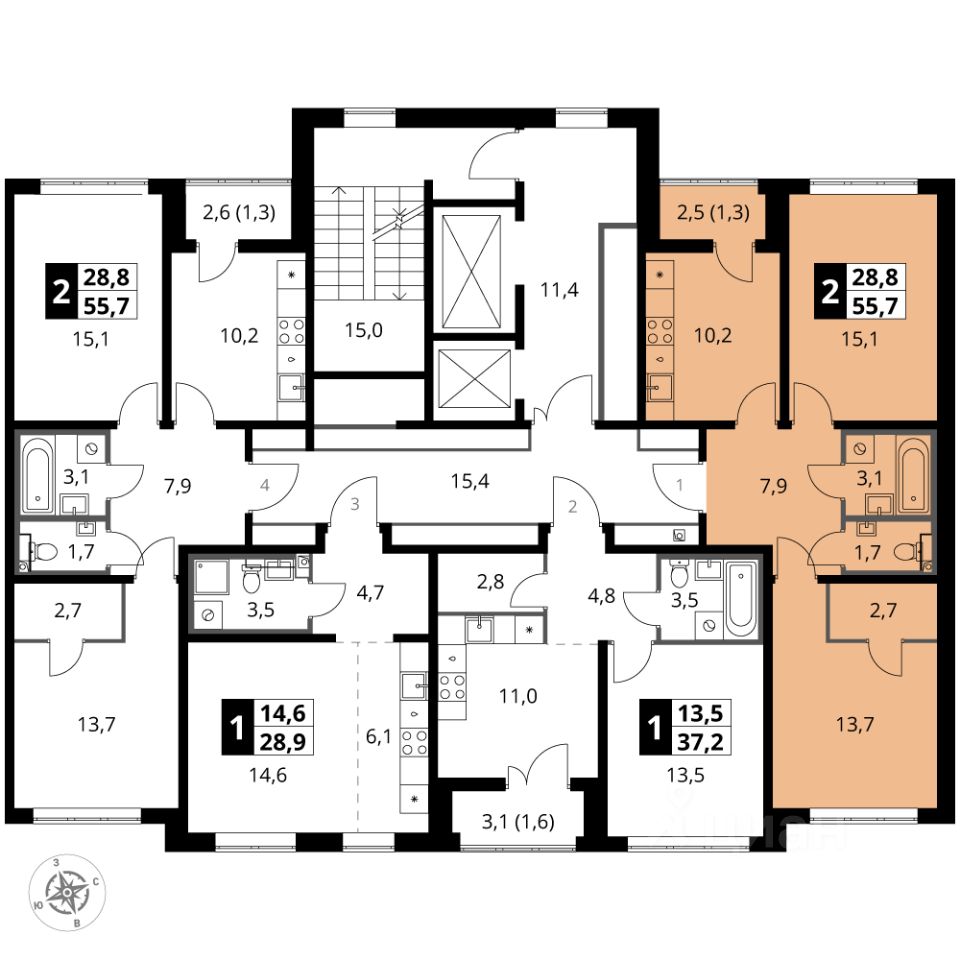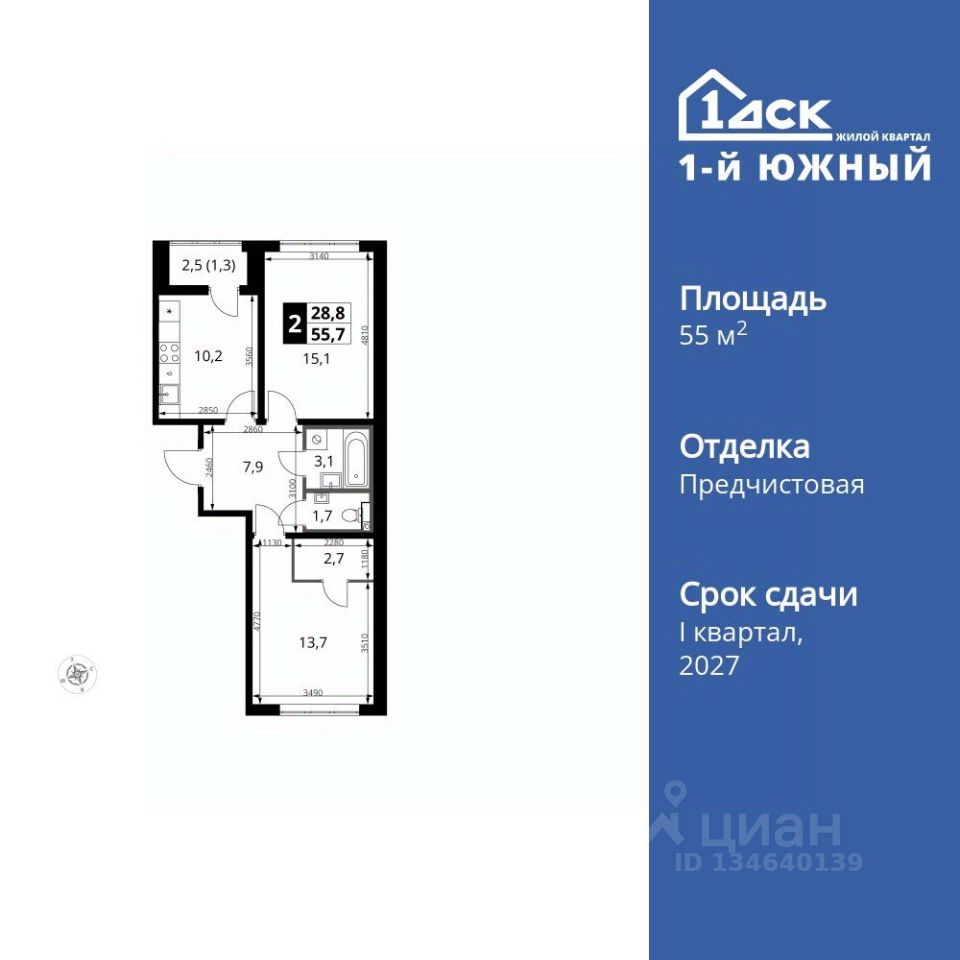 Продаётся 2-к квартира номер 438 общей площадью 55.7 кв.м. на 2-м этаже 24 этажного здания. Отделка Whitebox.