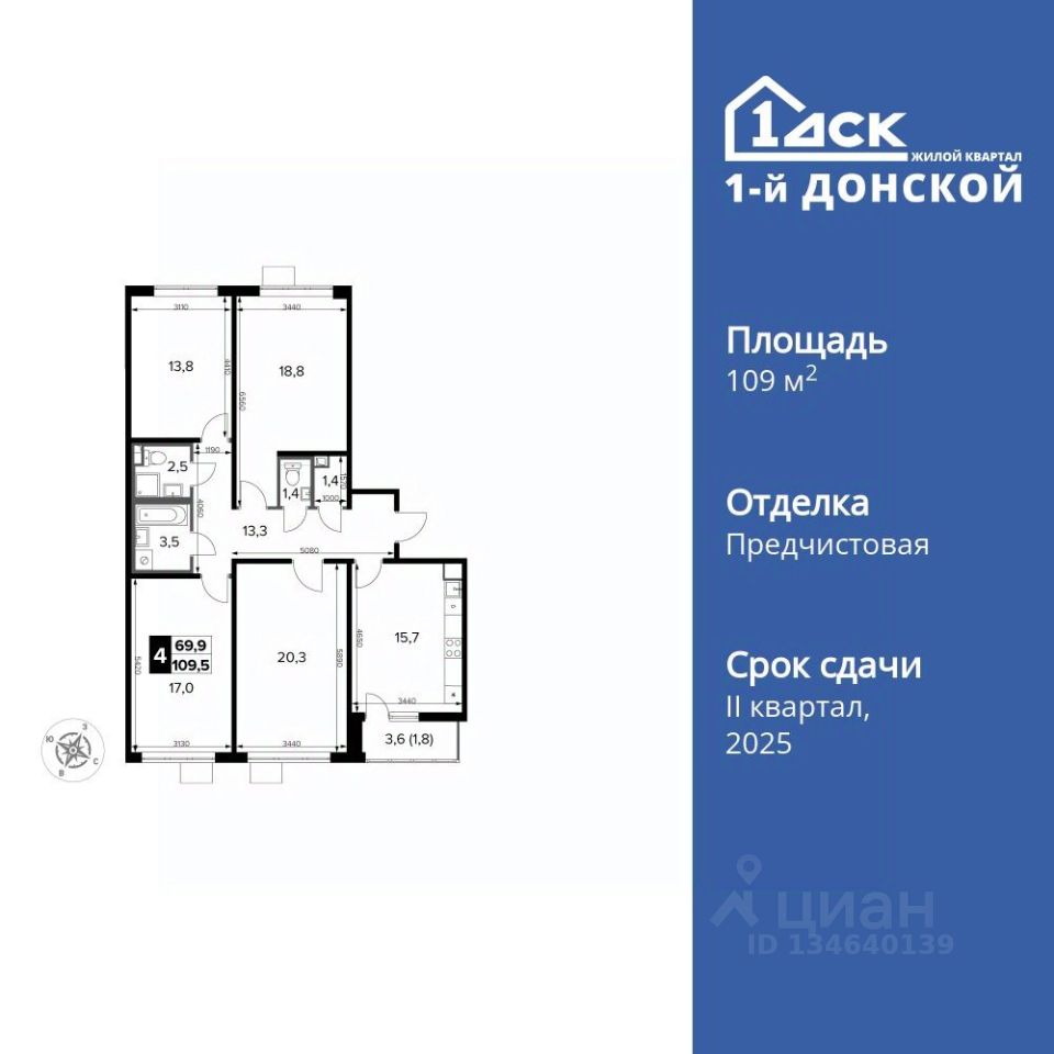 Продаётся 4-к квартира номер 256 общей площадью 109.5 кв.м. на 17-м этаже 24 этажного здания. Отделка Whitebox. Цена с учётом скидки.