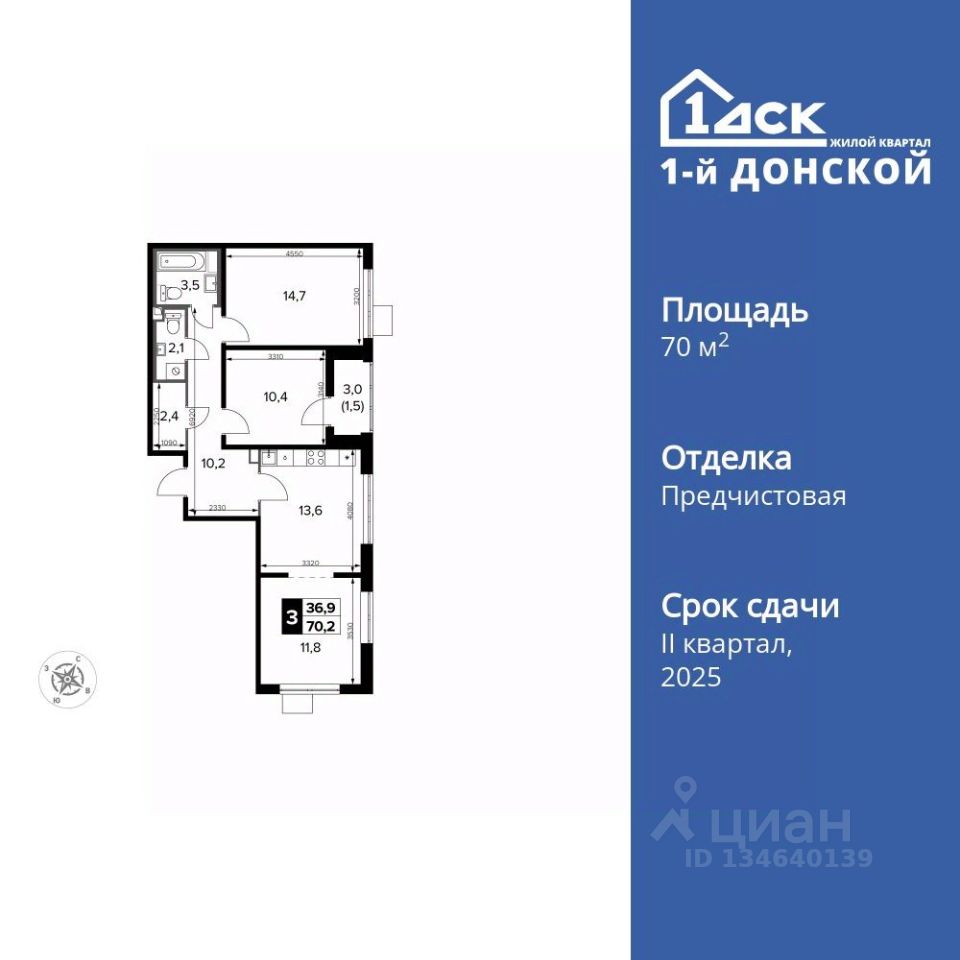 Продаётся 3-к квартира номер 364 общей площадью 70.2 кв.м. на 18-м этаже 24 этажного здания. Отделка Whitebox. Цена с учётом скидки.