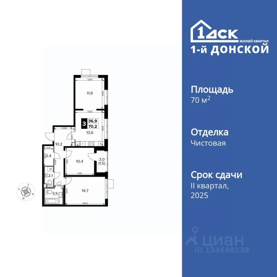 Продаётся 3-к квартира номер 116 общей площадью 70.2 кв.м. на 9-м этаже 21 этажного здания. Чистовая отделка. Цена с учётом скидки.