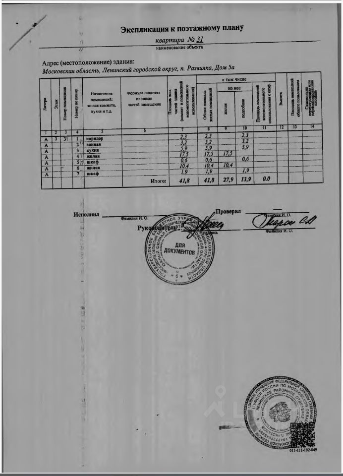 Квартира, общ. пл. 41,8 кв.м., к/н: 50:21:0050101:9008. Адрес: МО, Ленинский р-н, пос. Развилка, д. 5а, кв. 31.