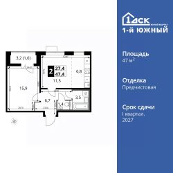 Продаётся 2-к квартира номер 55 общей площадью 47.4 кв.м. на 15-м этаже 24 этажного здания. Отделка Whitebox.