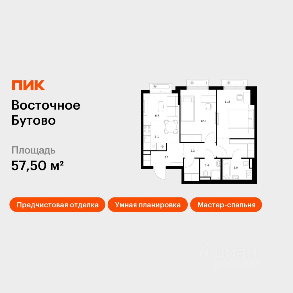 Продаётся 2-комн. квартира площадью 57,5 кв.м на 15 этаже 15 этажного дома (Корпус 48, Секция 3) проекта ПИК Восточное Бутово. Светлый просторный подъезд на уровне земли, функциональная планировка, большие окна, предчистовая отделка.