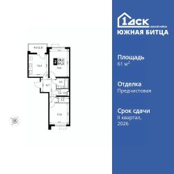 Продаётся 2-к квартира номер 90 общей площадью 61.3 кв.м. на 14-м этаже 22 этажного здания. Отделка Whitebox.