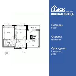 Продаётся 2-к квартира номер 382 общей площадью 59.1 кв.м. на 10-м этаже 22 этажного здания. Чистовая отделка.