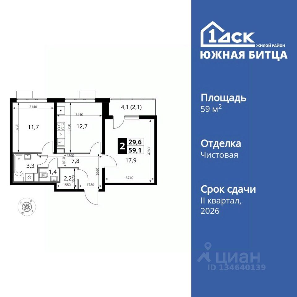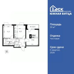 Продаётся 2-к квартира номер 390 общей площадью 59.1 кв.м. на 12-м этаже 22 этажного здания. Чистовая отделка.