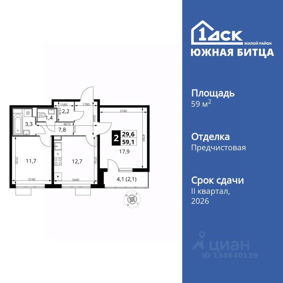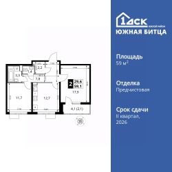 Продаётся 2-к квартира номер 594 общей площадью 59.1 кв.м. на 16-м этаже 22 этажного здания. Отделка Whitebox.