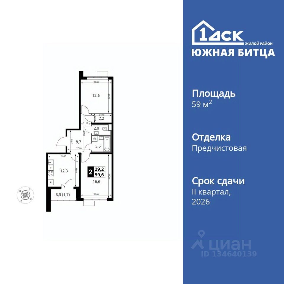 Продаётся 2-к квартира номер 700 общей площадью 59.6 кв.м. на 11-м этаже 22 этажного здания. Отделка Whitebox.
