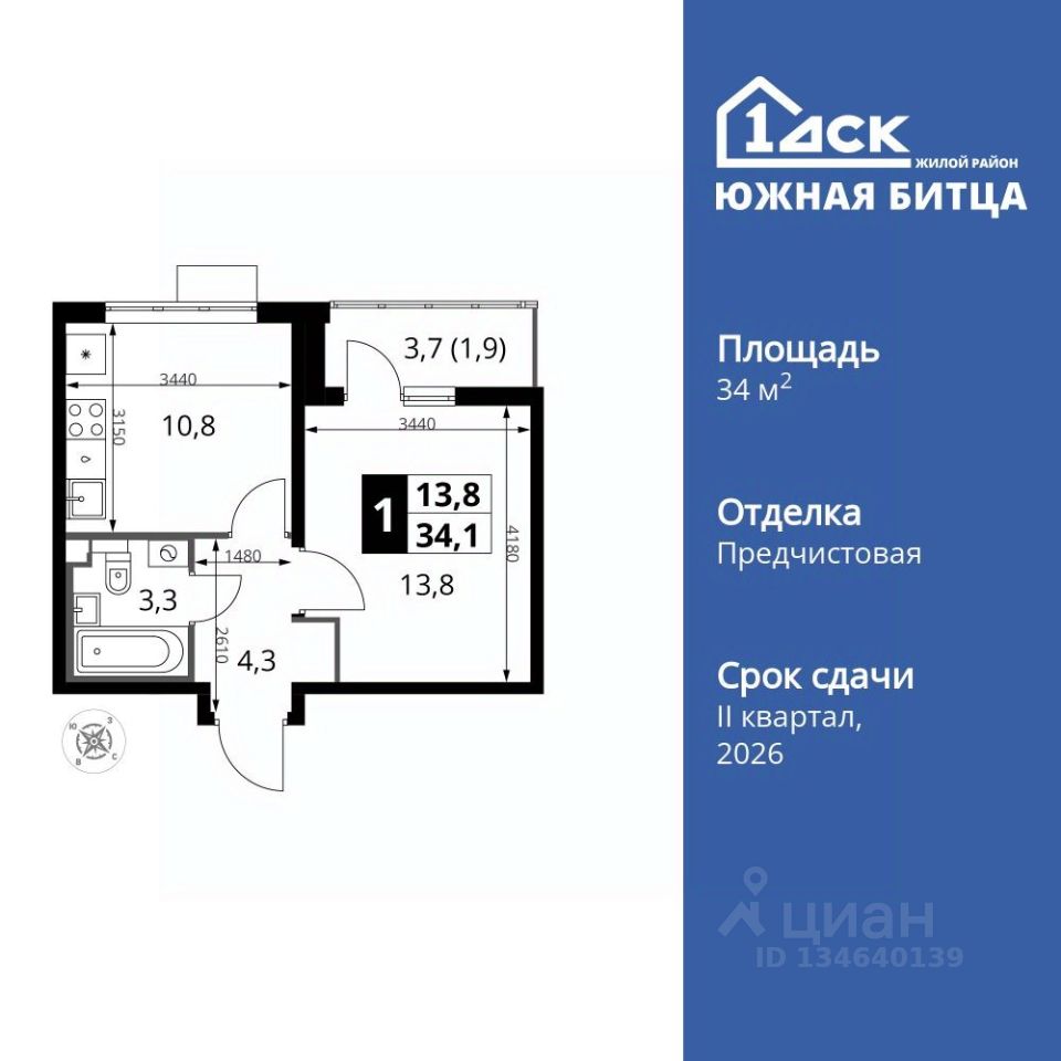Продаётся 1-к квартира номер 721 общей площадью 34.1 кв.м. на 13-м этаже 22 этажного здания. Отделка Whitebox.