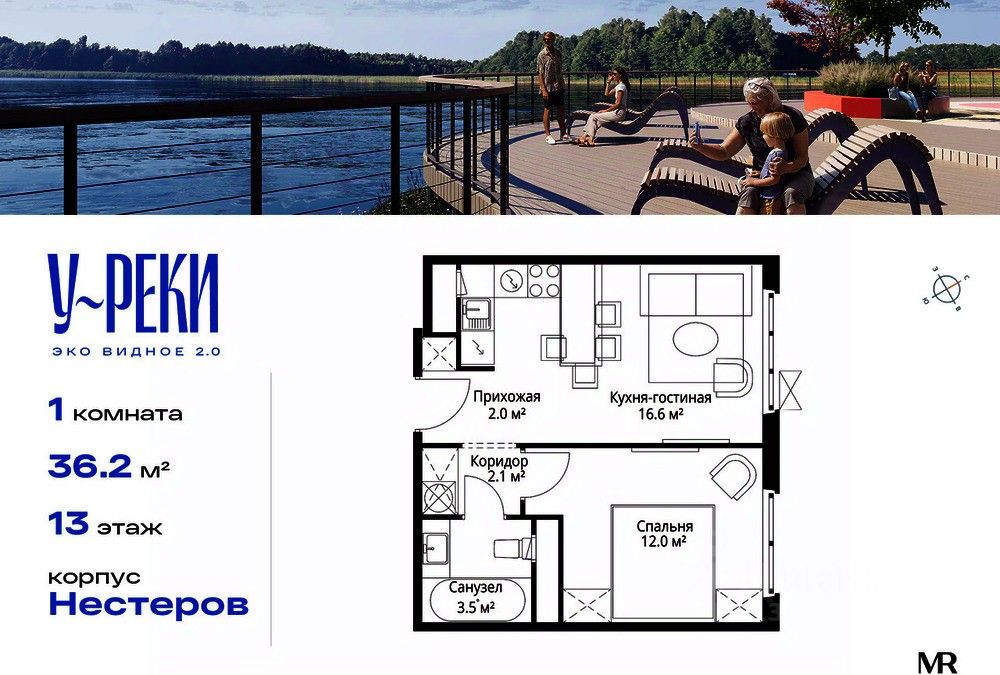 Продаётся 1-комнатная квартира общей площадью 36.20 м² с предчистовой отделкой в ЖК "У реки. Эко Видное 2.0" на 13-м этаже корпуса Нестеров.