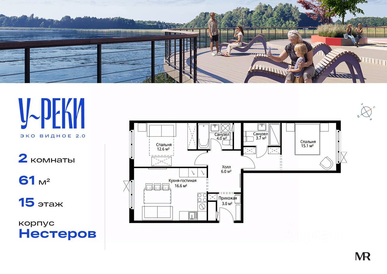 Продаётся 2-комнатная квартира общей площадью 61 м² с предчистовой отделкой в ЖК "У реки. Эко Видное 2.0" на 15-м этаже корпуса Нестеров.