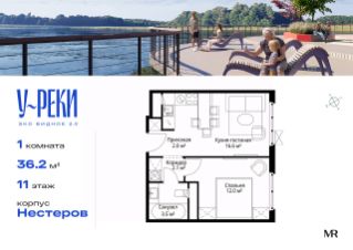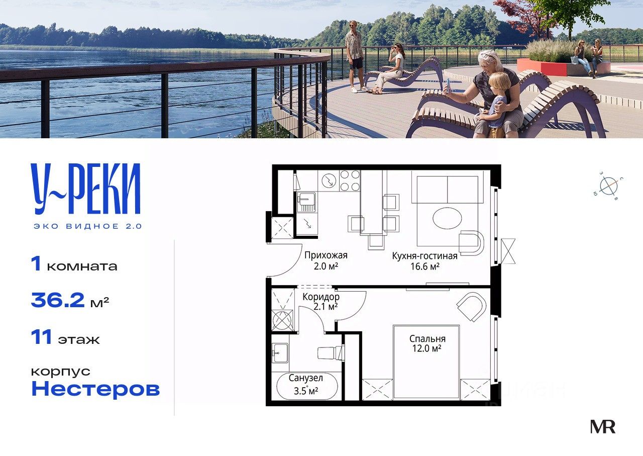 Продаётся 1-комнатная квартира общей площадью 36.20 м² с предчистовой отделкой в ЖК "У реки. Эко Видное 2.0" на 11-м этаже корпуса Нестеров.