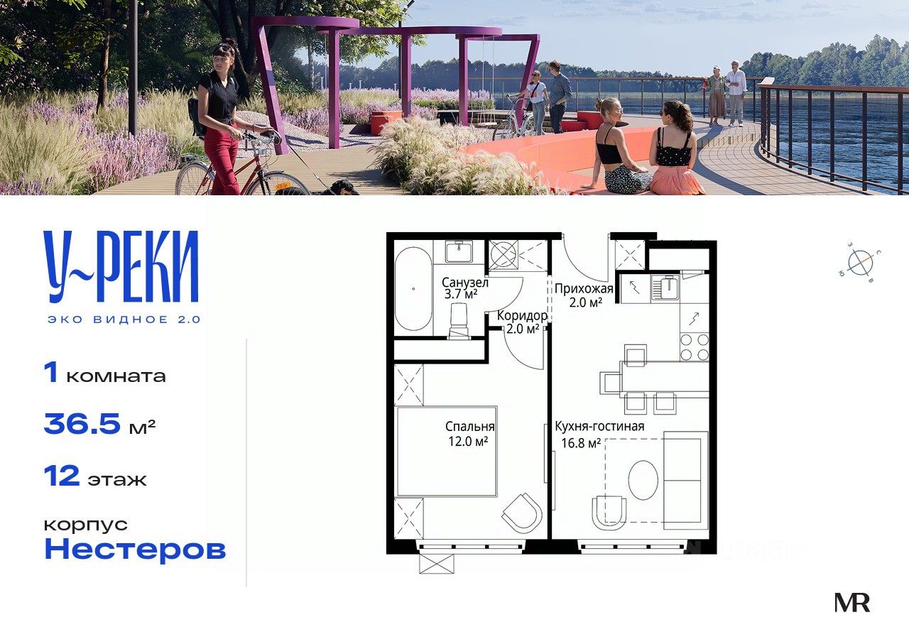 Продаётся 1-комнатная квартира общей площадью 36.50 м² с предчистовой отделкой в ЖК "У реки. Эко Видное 2.0" на 12-м этаже корпуса Нестеров.