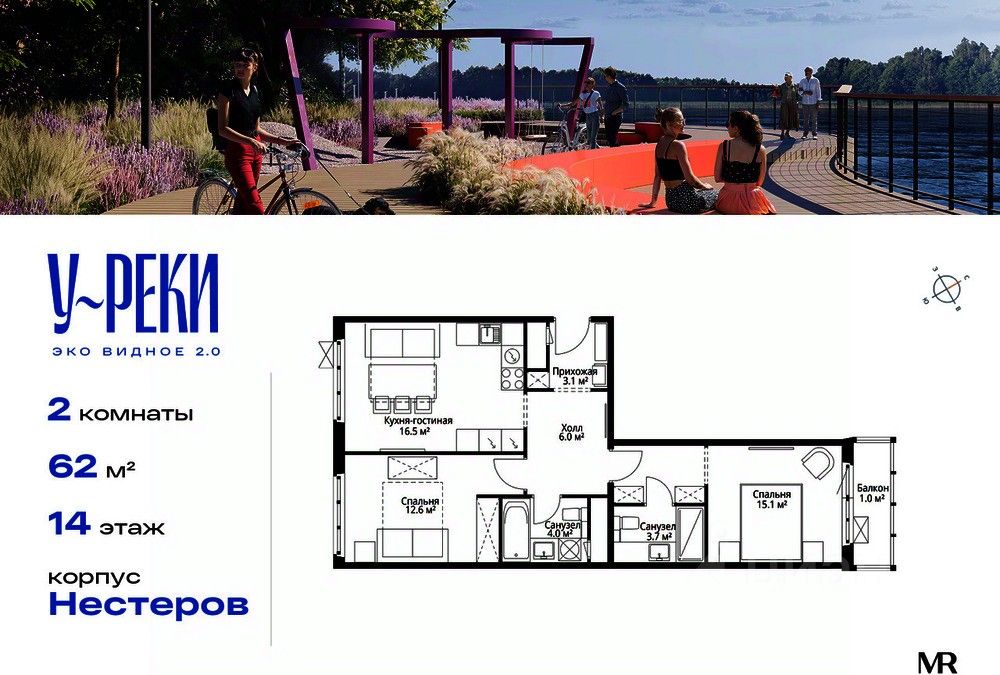 Продаётся 2-комнатная квартира общей площадью 62 м² с предчистовой отделкой в ЖК "У реки. Эко Видное 2.0" на 14-м этаже корпуса Нестеров.