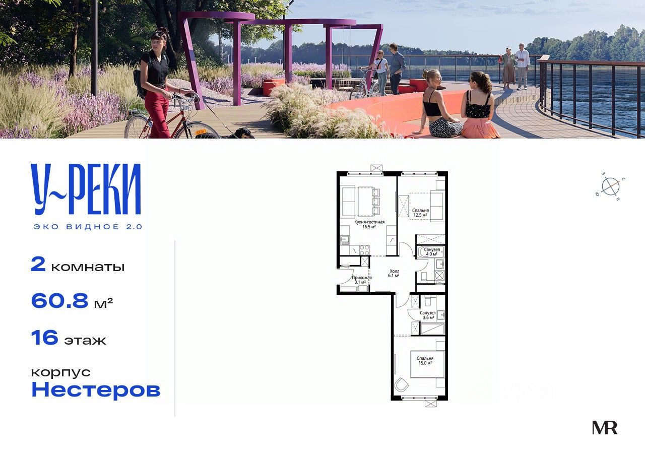 Продаётся 2-комнатная квартира общей площадью 60.80 м² с предчистовой отделкой в ЖК "У реки. Эко Видное 2.0" на 16-м этаже корпуса Нестеров.